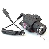 * Super bright 90Lumen LED Bulb * Black color polymer body * Crossbar mounting system mounts the flashlight and allows speedy installation and removal of the flashlight * Mode selector set various operation mode such as flashlight only, laser sight only and flashlight/laser sight the same time. Mode selector also works as a safety switch. * Dual Switches: Button switch turns on continuous beam of the flashlight or/and laser sight. Included cord remote switch turns flashlight or/and laser sight momentarily. * Two cord switches included, one for pistol use and a longer one for rifle use. * 650nm red laser sight is fully adjustable for Windage and Elevation with included Allen wrench. * 2x CR123 3Volt lithium batteries (included). Battery run time: approximately 2.5hours * Weight: 5 1/2oz (Batteries installed) * Size: 3 1/2"Lx 1 ½'W x 2'HThe flashlight fits onto Picatinny and Weaver rails including RAS/RIS. Please note the red beam in the picture is drawn to show the laser beam path and you will not see a red beam like it during actual use of the laser sight.
